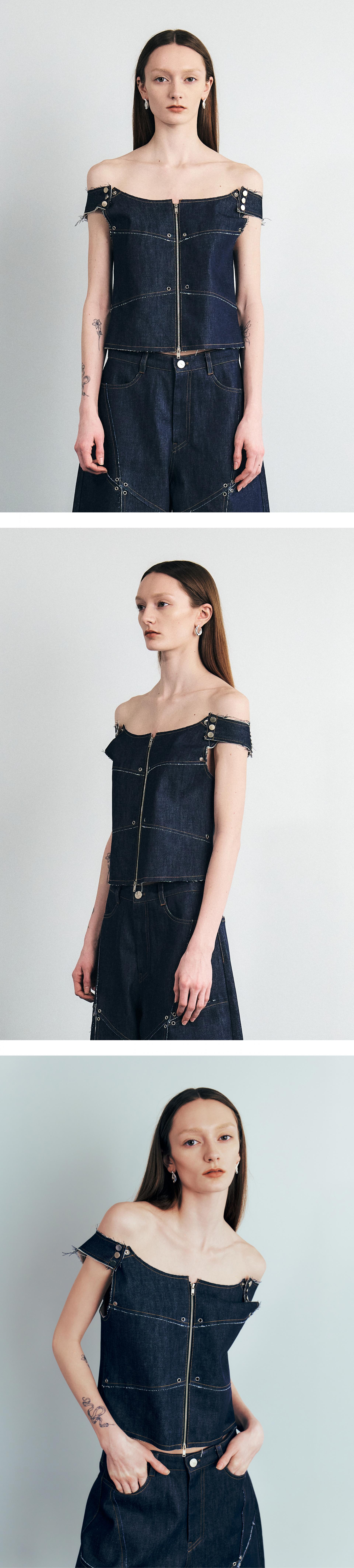실롯만의 절개의 로우 컷 디테일과 금속 스냅 및 아일렛이 어울려져 유니크한 무드의 베스트입니다.