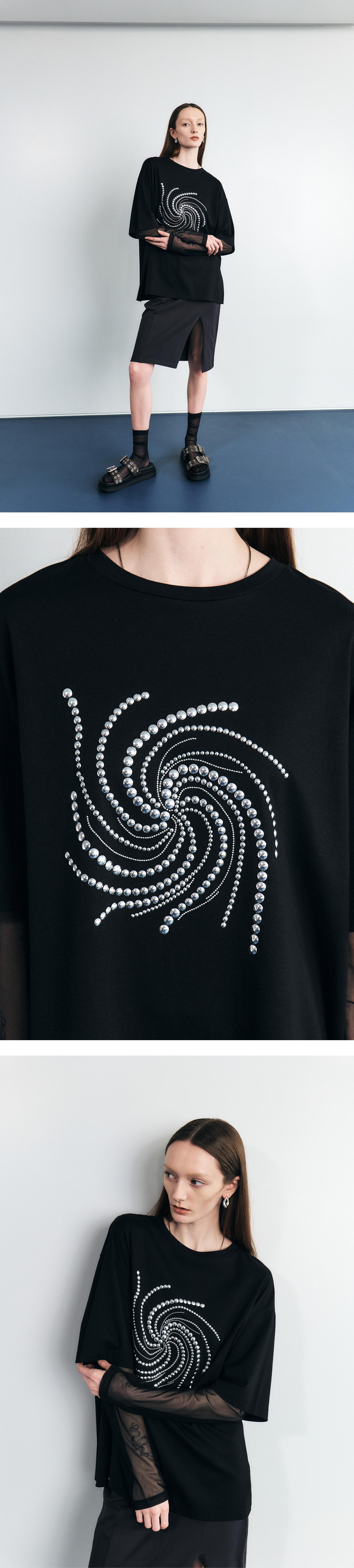 실롯의 24SUMMER의 그래픽을 금속 스터드를 사용하여 표현한 롱 슬리브 탑입니다.