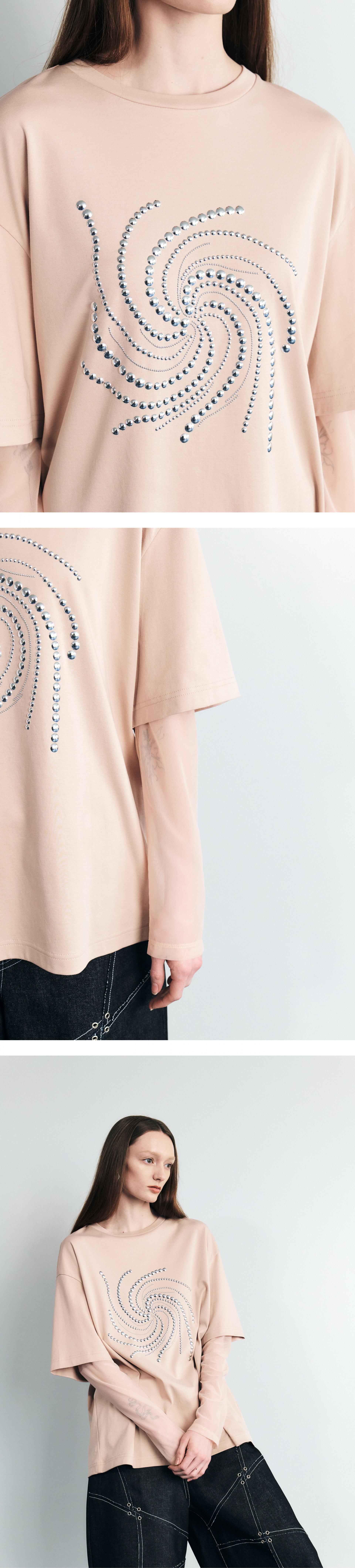 실롯의 24SUMMER의 그래픽을 금속 스터드를 사용하여 표현한 롱 슬리브 탑입니다.