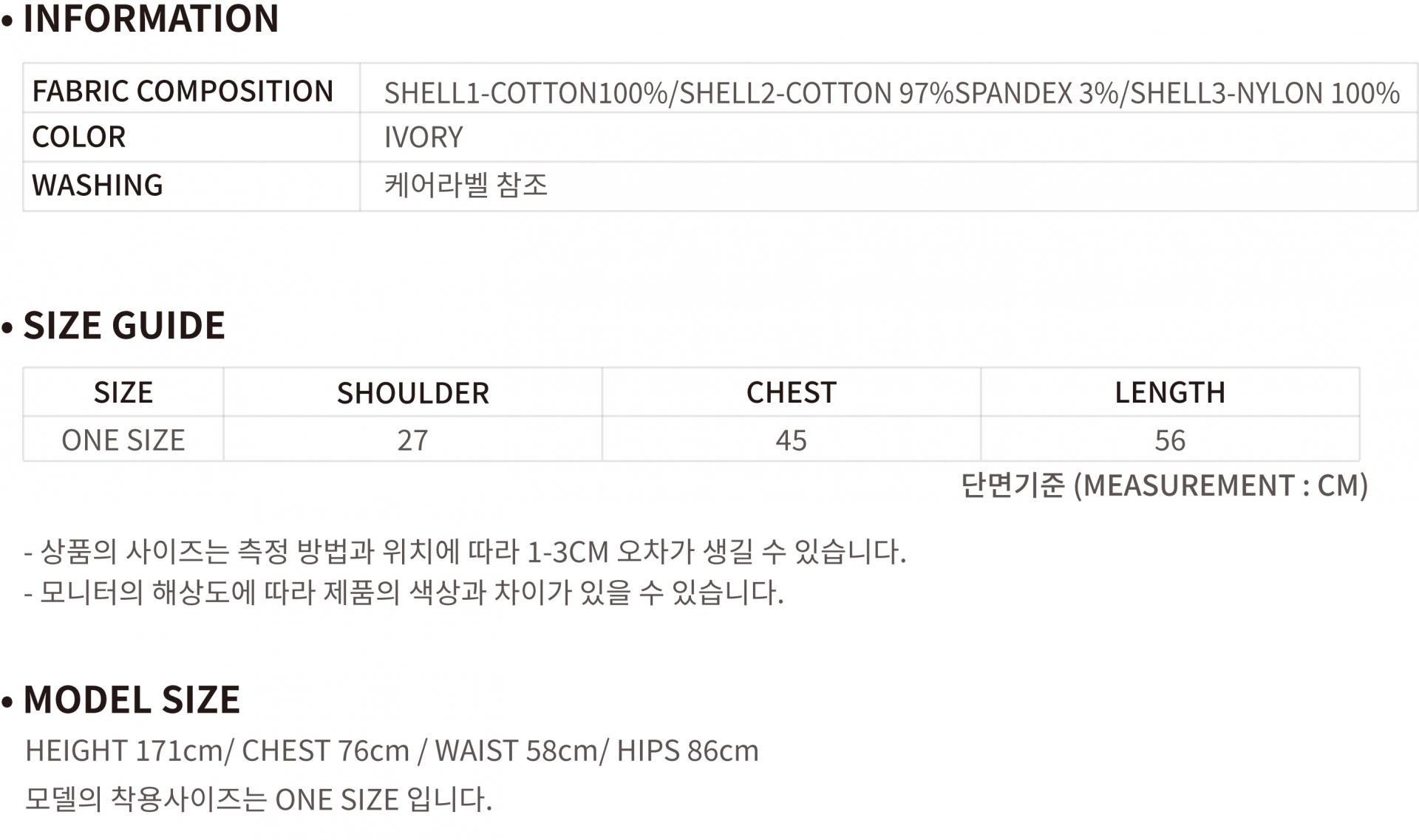코튼, 골지, 나일론 소재의 믹스로 유니크한 무드를 연출합니다.