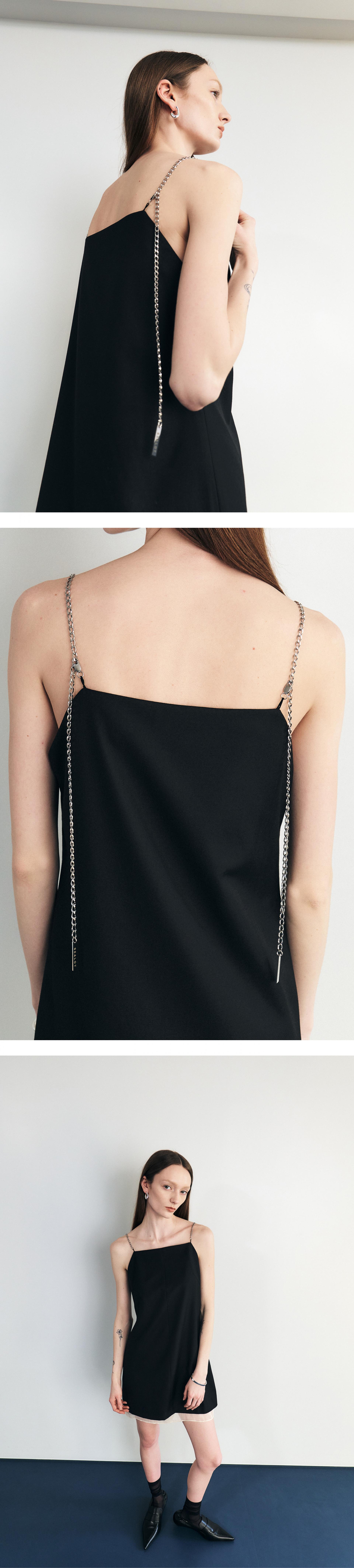 체인 디테일과 레이어드된 두 패브릭의 기장감과 원단감의 차이가 돋보이는 원피스입니다.