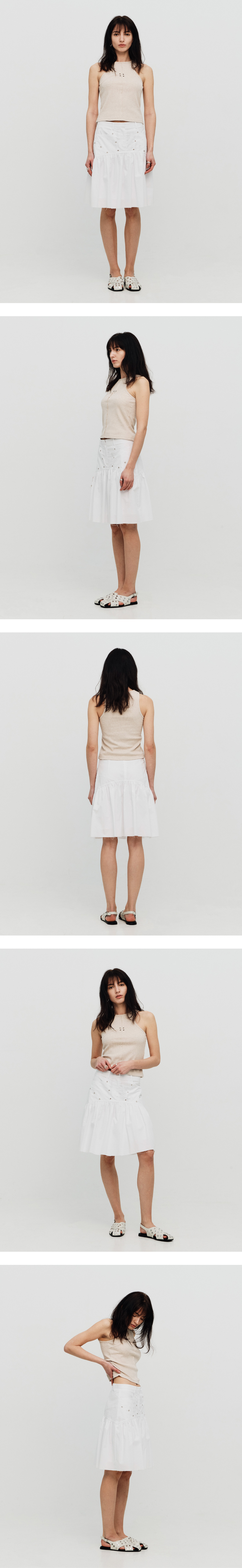 허리 아래로 자연스럽게 퍼지는 셔링 라인과 아일렛 디테일이 더해져 캐주얼하면서도 감각적인 분위기를 연출합니다.