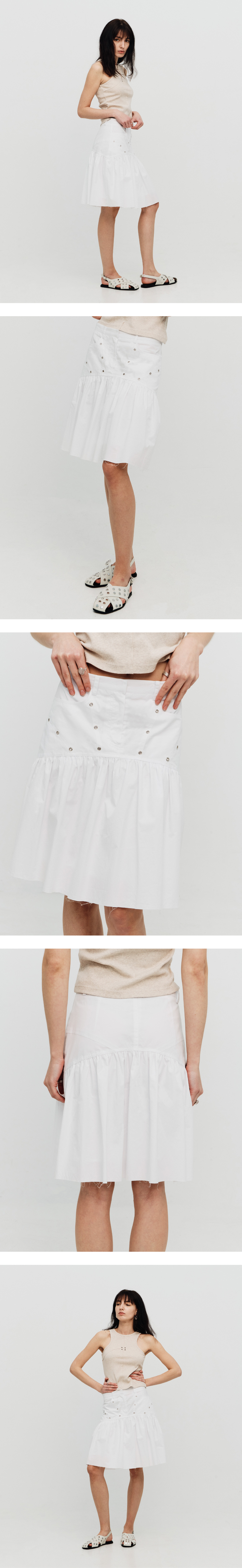 RAW CUT EYELET SHIRRING MIDI SKIRT (WHITE)