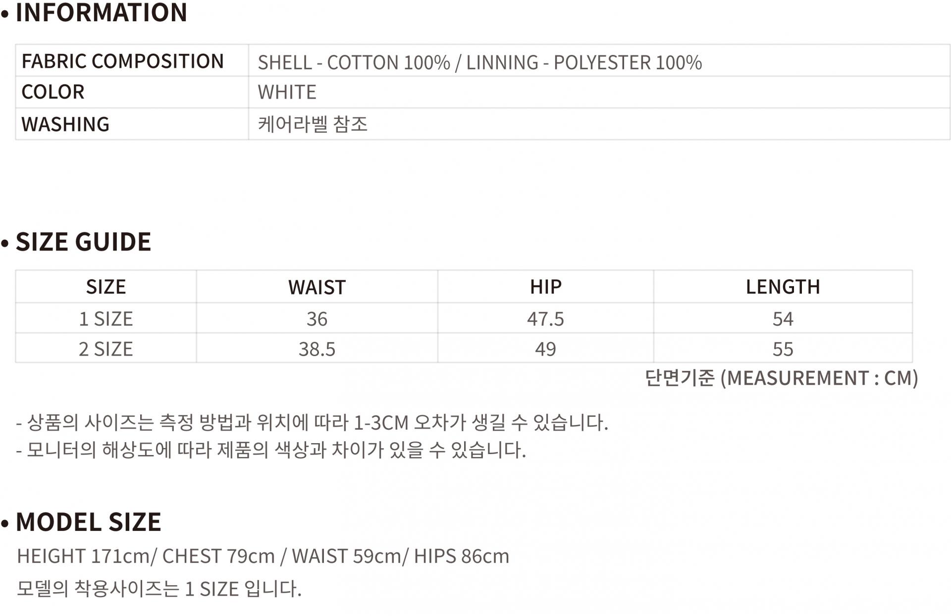 가벼운 코튼 100%소재로 제작되었으며, 안감이 있어 비침을 방지하였고, 상의에 따라 다양한 룩에 매치하기 용이합니다.